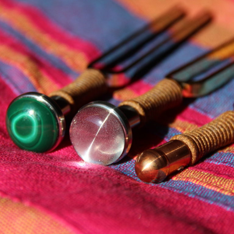 Durch das Anschlagen der Stimmgabeln entstehen Schwingungen, die beim sanften Aufsetzen auf verschiedene Punkte auf deinen Körper ausgleichend und entspannend wirken und durch die Resonanz deine Energie zum Fließen bringen, weshalb man auch von Tonpunktur spricht.